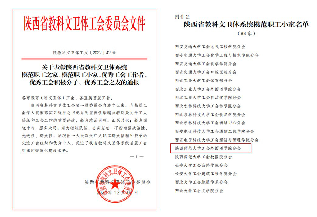 近日,根据陕西省教科文卫体工会《关于开展陕西省教科文卫体系统模范职工之家、模范职工小家、优秀工会工作者、优秀工会积极分子、优秀工会之友选树活动的通知》,经学院工会积极申报,学校工会评比推荐,永利官网工会获得由陕西省教科文卫体工会授予的“陕西省教科文卫体系统模范职工小家”荣誉称号。