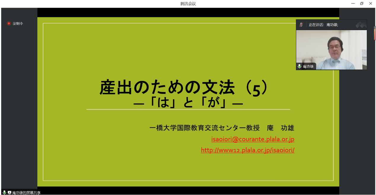 2023年10月15日上午9点,永利官网通过腾讯会议平台成功举办了以“日本語教育文法の実際:「は」と「が」”为主题的第181场明德讲堂系列讲座,即一带一路背景下西部日语教师教育系列的第9场讲座。本次讲座由日本一桥大学国际教育交流中心庵功雄教授主讲,永利官网史曼副教授主持,20多名校内外师生参加了此次讲座。