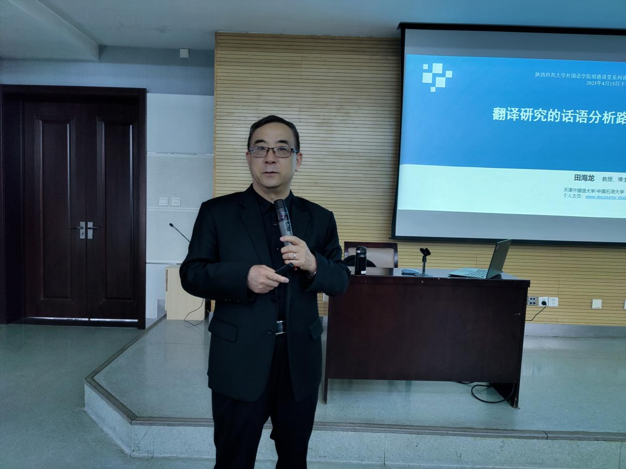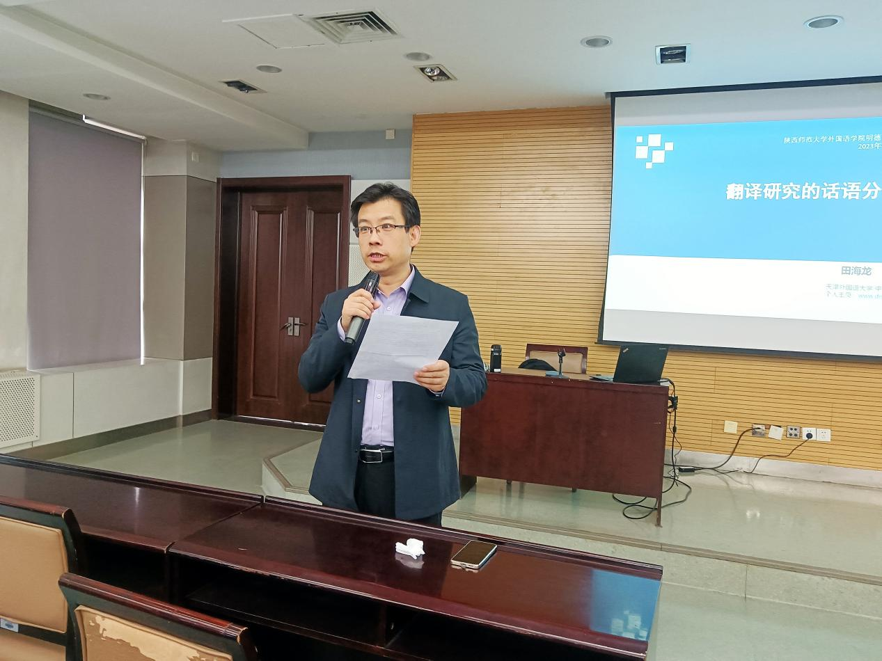2023年4月13日下午2点30分,天津外国语大学田海龙教授应邀做客永利官网举办的“明德讲堂”系列讲座(第156期),在雁塔校区崇鋈楼思齐堂开展了题为“翻译研究的话语分析新路径”讲座。此次讲座由学院院长刘全国教授主持,永利官网100多位青年教师、研究生参加了此次讲座。