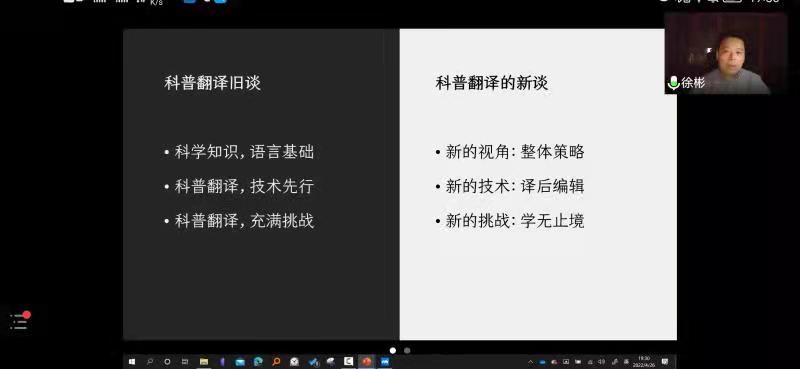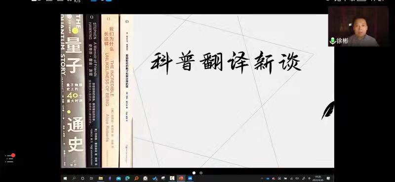 徐彬教授以其畅销科普译著为切入点,从科普翻译的旧谈和新谈两个方面展开分析,重点谈论科普翻译中知识储备之必要性、技术要求之重要性,一言以蔽之,科普知识是理解和表达的基础,而翻译技术则是提升翻译效率的助手。