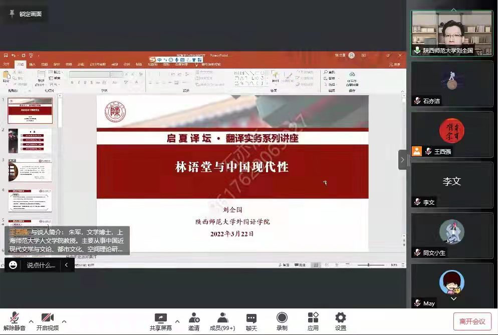2022年3月22日,永利集团3044am官方入口“启夏译坛”第1讲暨“翻译实务系列讲座”第4季第2讲《林语堂与中国现代性》云端开讲。讲座由永利官网院长、国家社科基金重大招标项目首席专家刘全国教授主讲、上海师范大学人文学院朱军教授与谈,永利官网MTI中心副主任王西强教授主持报告并总结,全国近40所高校的专家、学者和学生及永利官网师生共计360余人线上参加讲座并积极互动。