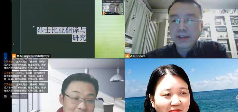 2022年4月14日,永利集团3044am官方入口“启夏译坛”第3讲暨“翻译实务系列讲座”第4季第4讲《莎士比亚翻译与研究》云端开讲。讲座由著名翻译家、首都师范大学永利集团3044am官方入口教授、博士生导师、首都师范大学外国诗歌研究中心研究员傅光明教授主讲,永利官网张亚婷教授与谈,王西强教授主持报告并总结,全国多所高校的专家、学者和学生及永利官网师生共计200余人线上参加讲座并积极互动。