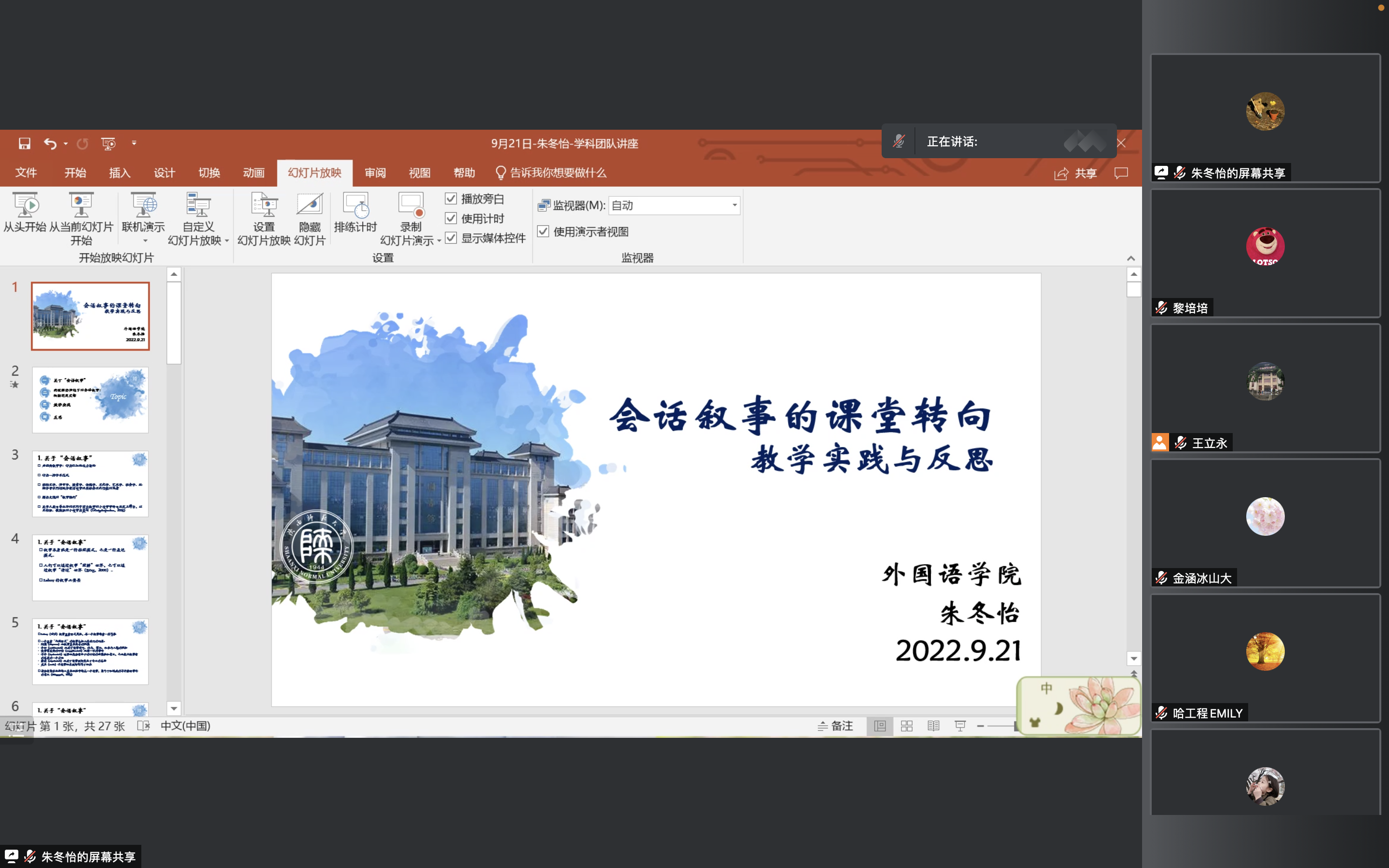 朱冬怡副教授首先从会话叙事本身谈起,表明会话叙事就是日常会话中的故事讲述行为。接着,她以时间为脉络,简单梳理了叙事学的发展路径。朱冬怡副教授深入浅出,用生动的事例,层层论证会话叙事的要素及特征。最后,朱冬怡副教授以自身研究经历为出发点,通过展示课堂语料,同大家分享了如何进行课堂语境下的会话叙事研究,并强调课堂语境下的会话叙事能调动学生的学术情感及思辨性能力,研究贯穿于教学之中,二者相互促进,相互融合。
